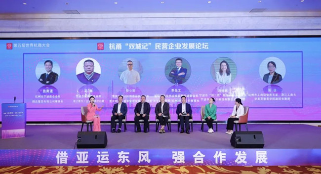 为紧抓杭州亚运会带来的发展机遇,充分发挥第五届世界杭商大会的资源优势和品牌效应,搭建杭州、宁波两地商会合作交流平台,11月9日下午,由杭州市工商联、宁波市工商联主办,拱墅区委区政府承办的主题为“借亚运东风 强合作发展”的第五届世界杭商大会专题活动——杭甬“双城记”民营企业发展论坛暨“世界杭商拱墅行”在拱墅区举办。
