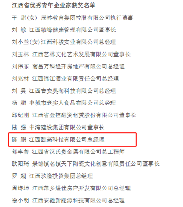 2019年9月,第七届“江西省杰出(优秀)青年企业家”评选活动正式开始,评选活动由团省委、省工商联、江西日报社指导,江西省青年企业家协会、江西省非公有制经济发展服务中心、江西日报社大江网、信息日报社联合开展。