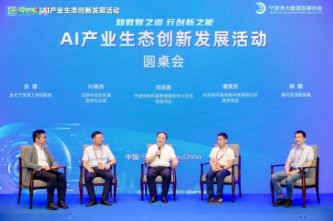 圆桌会谈环节由中组部"千人计划"国家特聘专家、浙大宁波理工学院教授谈建主持。宁波市软件园管理服务中心主任刘宗胜,互联科技实验室首席科学家叶晓舟,指令集智能科技首席专家潘爱民,浙江大学CCAI宁波中心负责人董重青,颐高集团副总裁顾鹏等嘉宾,围绕AI技术落地、产城融合、生态共建等议题展开深度对话,为现场观众带来了一场思想盛宴。