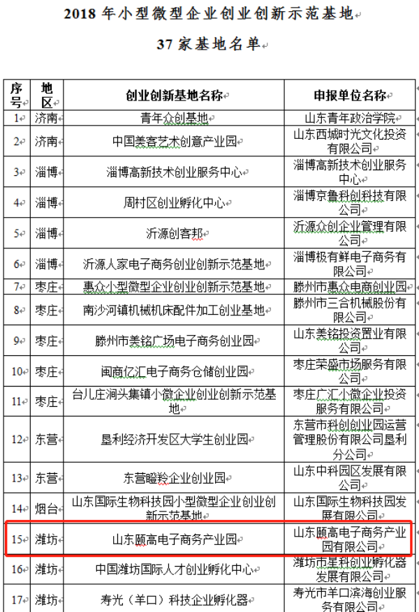 为进一步推动科技企业孵化器、众创空间以及小型微型企业建设发展,按照《山东省科学技术厅关于加快推进全省科技企业孵化器专业化发展的实施意见》、《关于印发<山东省众创空间和科技企业孵化器备案服务管理办法>的通知》、山东省科技厅对申请备案的科技企业孵化器和众创空间进行了审核,并发布《2018年度第一批山东省科技企业孵化器和众创空间备案名单公示》。根据《关于推荐2018年度山东省小型微型企业创业创新示范基地的通知》,山东省中小企业局开展了2018年度山东省小型微型企业创业创新示范基地评审工作,并发布了《2018年度山东省小型微型企业创业创新示范基地名单公示》。“山东颐高电子商务产业园”均成功上榜。