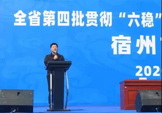 4月15日,2020年安徽第四批贯彻“六稳”重大项目集中开工现场推进会宿州分会场在灵璧颐高国际电商园奠基现场举行,宿州市委书记史翔、市长杨军以及市辖各区县政府领导现场发布全市重大项目推进落地概况。颐高集团董事长翁南道受邀参加,并作为项目东道主分享颐高宿州及安徽投资情况及计划。